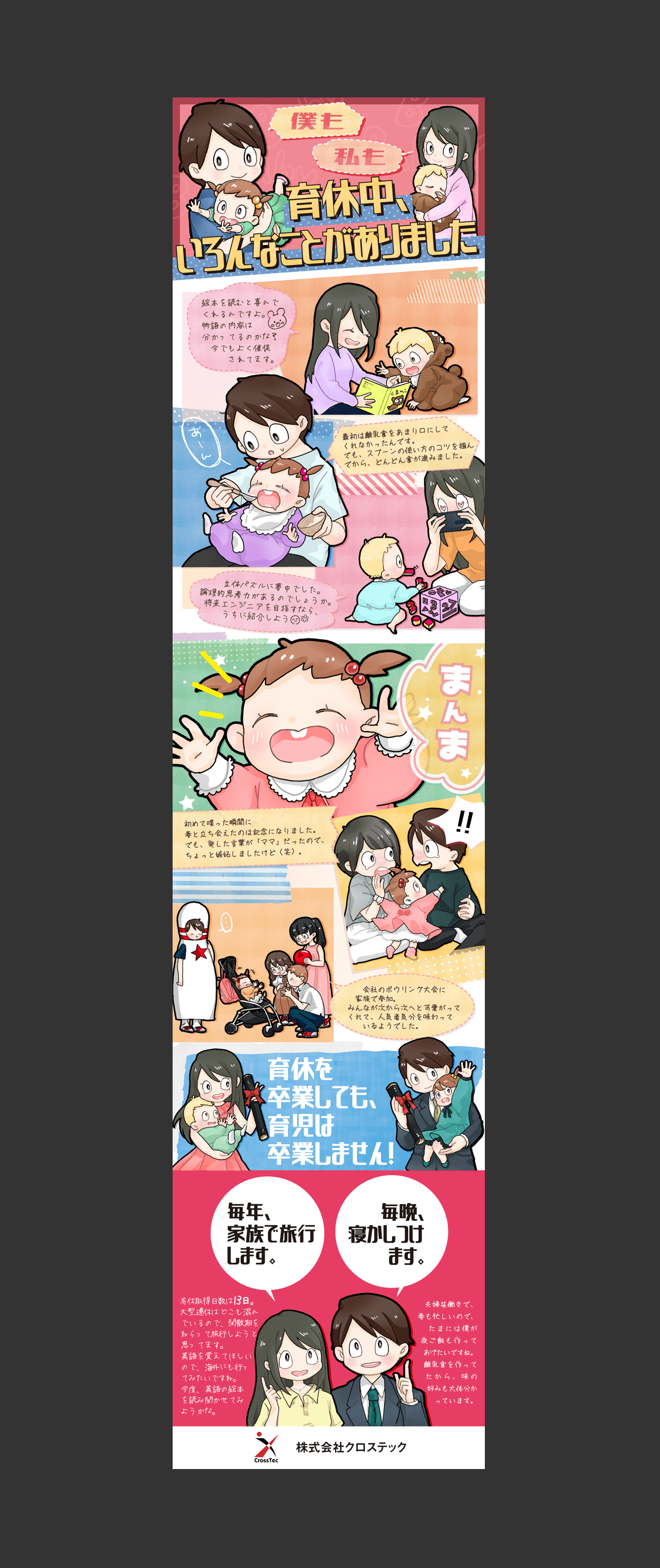 描かれているのは「最初は離乳食を口にしてくれなかったけれど、スプーンの使い方のコツを掴んでからは食が進んだ」「子どもが初めて喋った瞬間に夫婦で立ち会うことができた」など、育児にまつわるさまざまな出来事。家族の時間を確保でき、育児に取り組めている方が感じることのできる嬉しい瞬間を切り取りました。また、育児休暇を終えて復帰してからも、残業が少なく有給を取りやすい風土がある同社。混雑する長期休暇を避けて家族旅行に出かけられたり、子どもの好みを把握した上で夕食づくりを分担できたり、子育て家族ならではの悩みも抱えにくいことを伝えています。これからも協力して育児を続けられる未来まで描くことで、将来の安心も感じられる原稿に仕上げました。