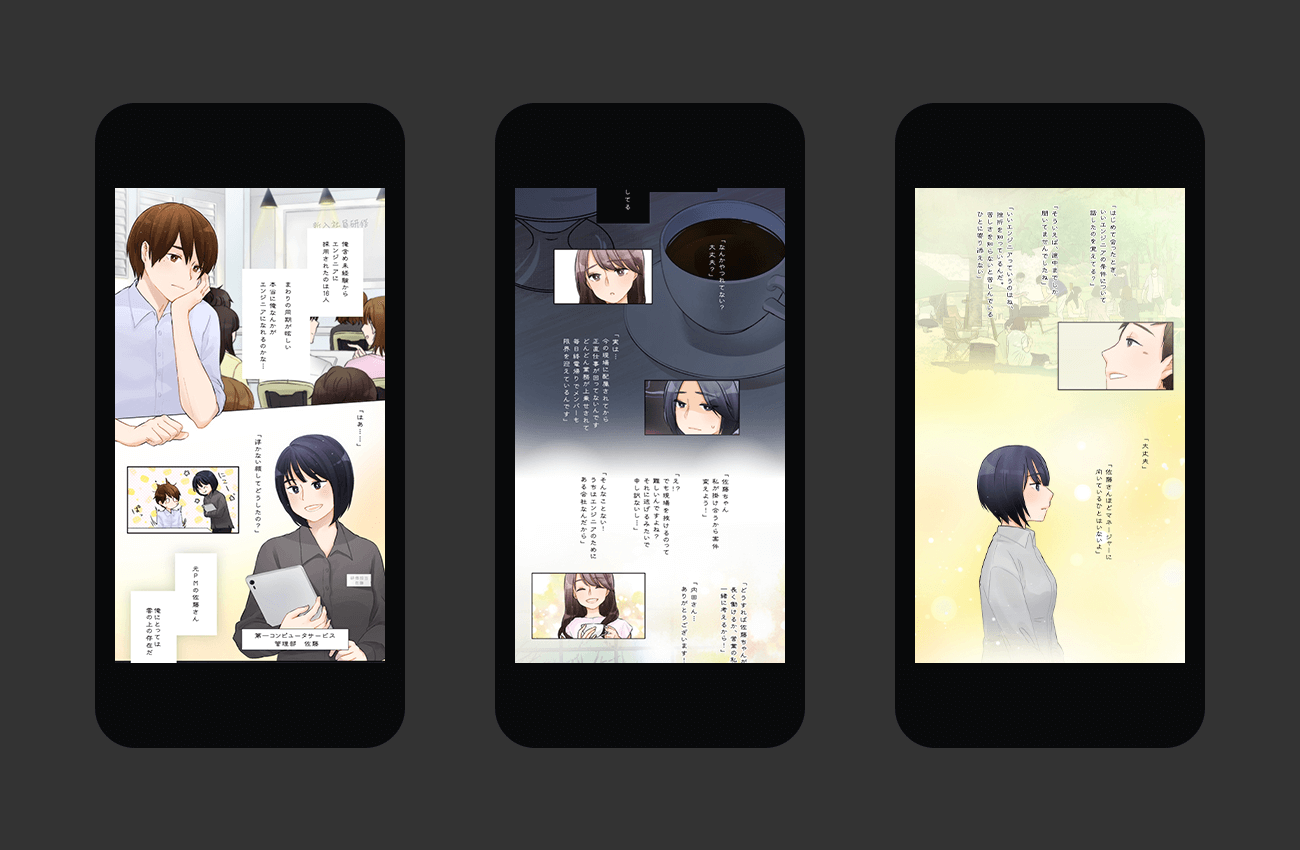取材ではエンジニアとしてPMを経験し、現在は教育担当として新入社員育成を担っている社員のS様にインタビューしました。社内イベントに誘われたことをきっかけにエンジニアとしての働き方に興味を持ち、未経験からエンジニアとして活躍するようになったS様。挫折と成功を繰り返し成長していくお姿と、周囲の方々との心あたたまるエピソードを存分に伝えるために、インパクトのある漫画という手法を選びました。漫画を担当したのは弊社のデザイナー。やわらかで愛らしいキャラクターデザインや、ブラー効果を感じさせる色彩設計で、企業の想いやカルチャーが伝わるテイストに仕上げました。