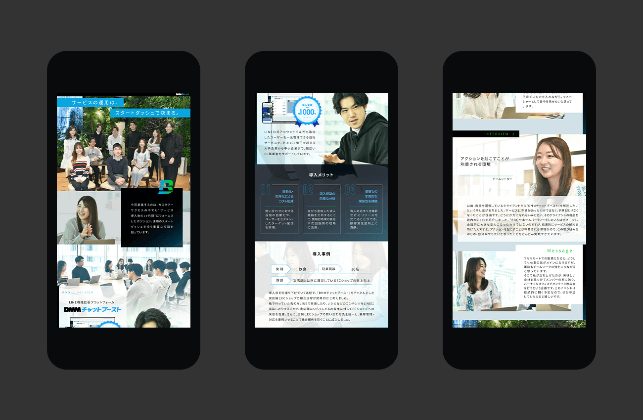 非大卒人材向けの就労支援『ヤンキーインターン』を提供し、選択格差のない社会の実現をテーマに人材領域で事業拡大を続けてきたDMM Boost様。2021年7月にはSaaS事業の急成長に伴い、『DMMチャットブースト』という自社開発サービスをローンチ。短期間で全国1000社以上に導入するなど、テックカンパニーとして新たな一歩を踏み出されました。第二創業期とも言えるフェーズを迎え、『DMM チャットブースト』を拡販するための大量採用が急務。しかし教育に充てる人員コストを捻出するのが難しく、要件的にセールスやカスタマーサクセスの経験は譲れない。そこでDMM Boost様のカスタマーサクセス職ならではの魅力に焦点を当て、競合他社と差別化を図りました。