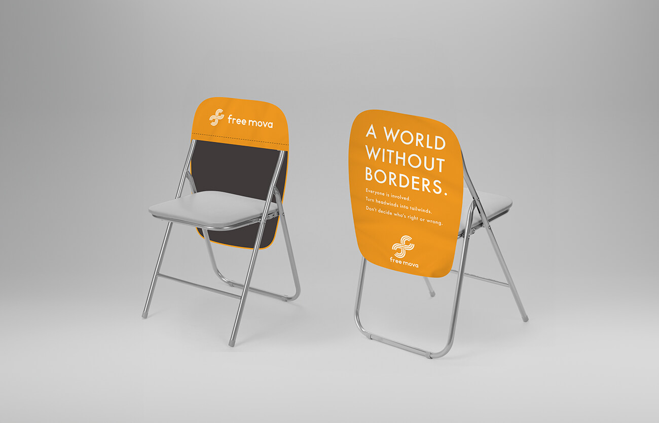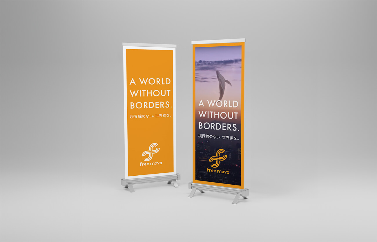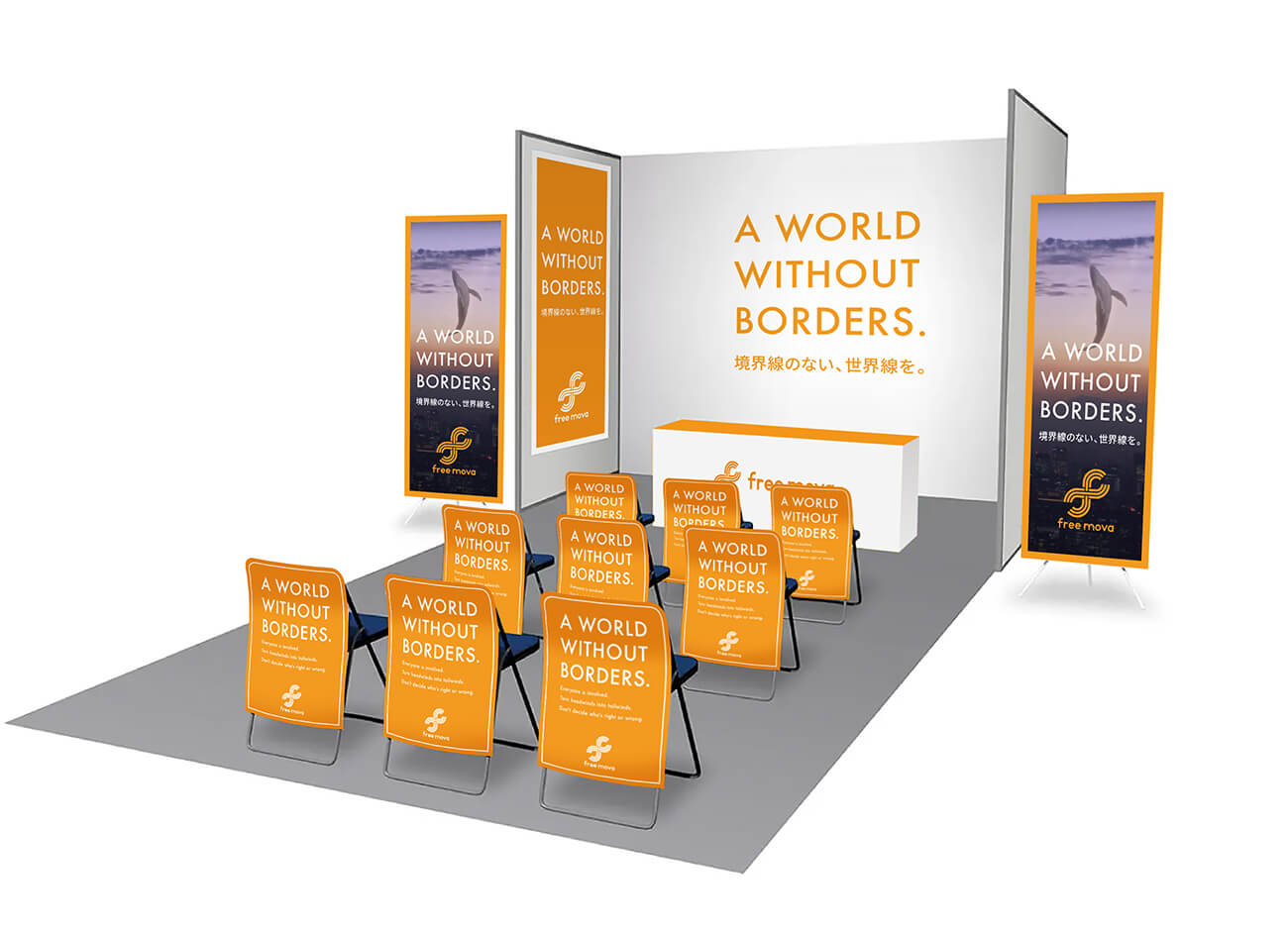 転職イベントの出展ブース、それはブランドコンセプトを視覚的に表現するには絶好の場所。「境界線のない、世界線を。」というコンセプトワードや新たなロゴを反映した統一感のあるデザインで、ブースの顔となるテーブルカバーやチェアカバー、クリアファイル、タペストリーなど幅広いノベルティを制作しました。もちろんそれらは全て転職博の現場で使用。free mova様が企業として目指す姿に、より説得力を与える役割を果たしていました。