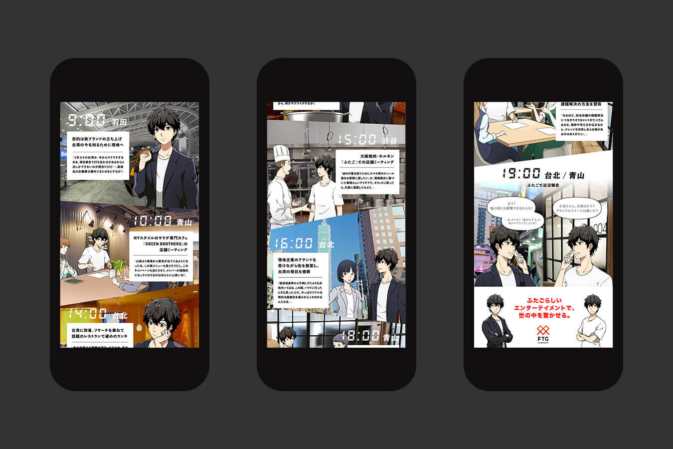 ただ単にサプライズを与えるのではなく、FTG Company様だからこそできる表現でサプライズを与えれば、求職者のハートをより強く掴めると考えました。FTG Company様は、実は創業者が双子。FTGという社名も、「ふ・た・ご」の頭文字が取られています。そこで考えたのが、以下の構成です。