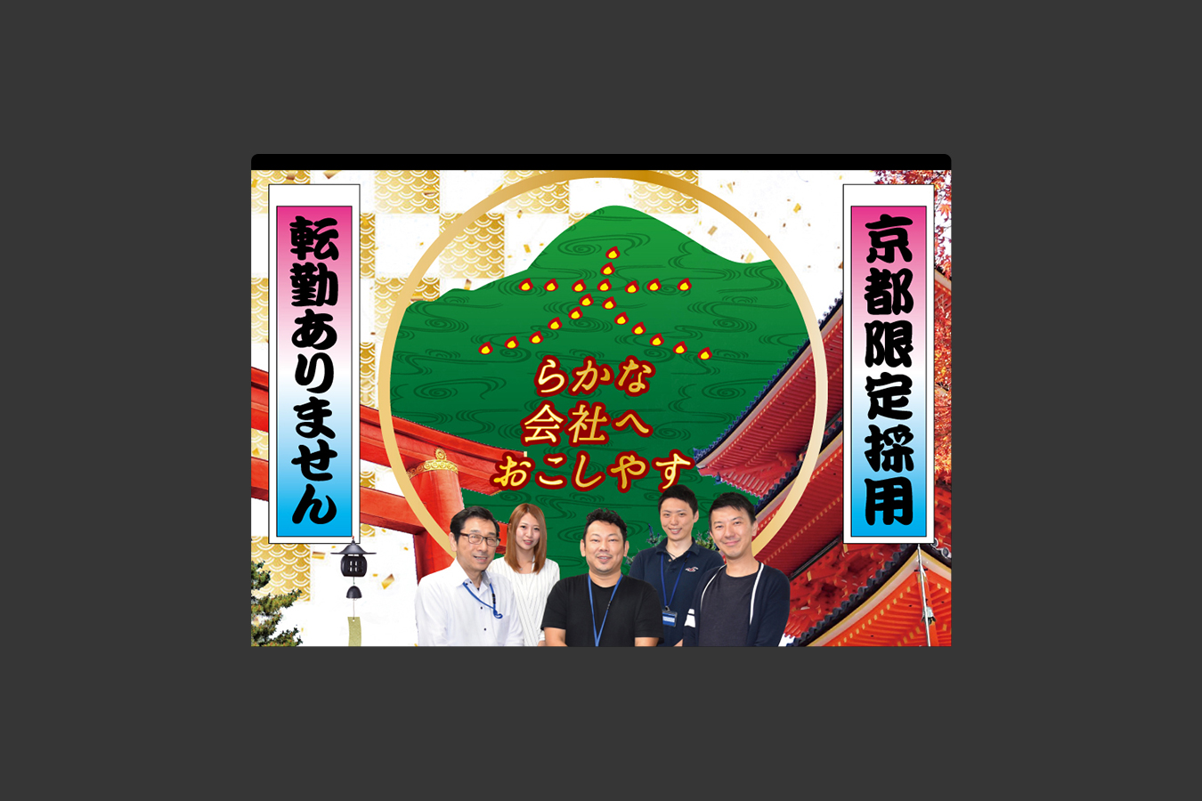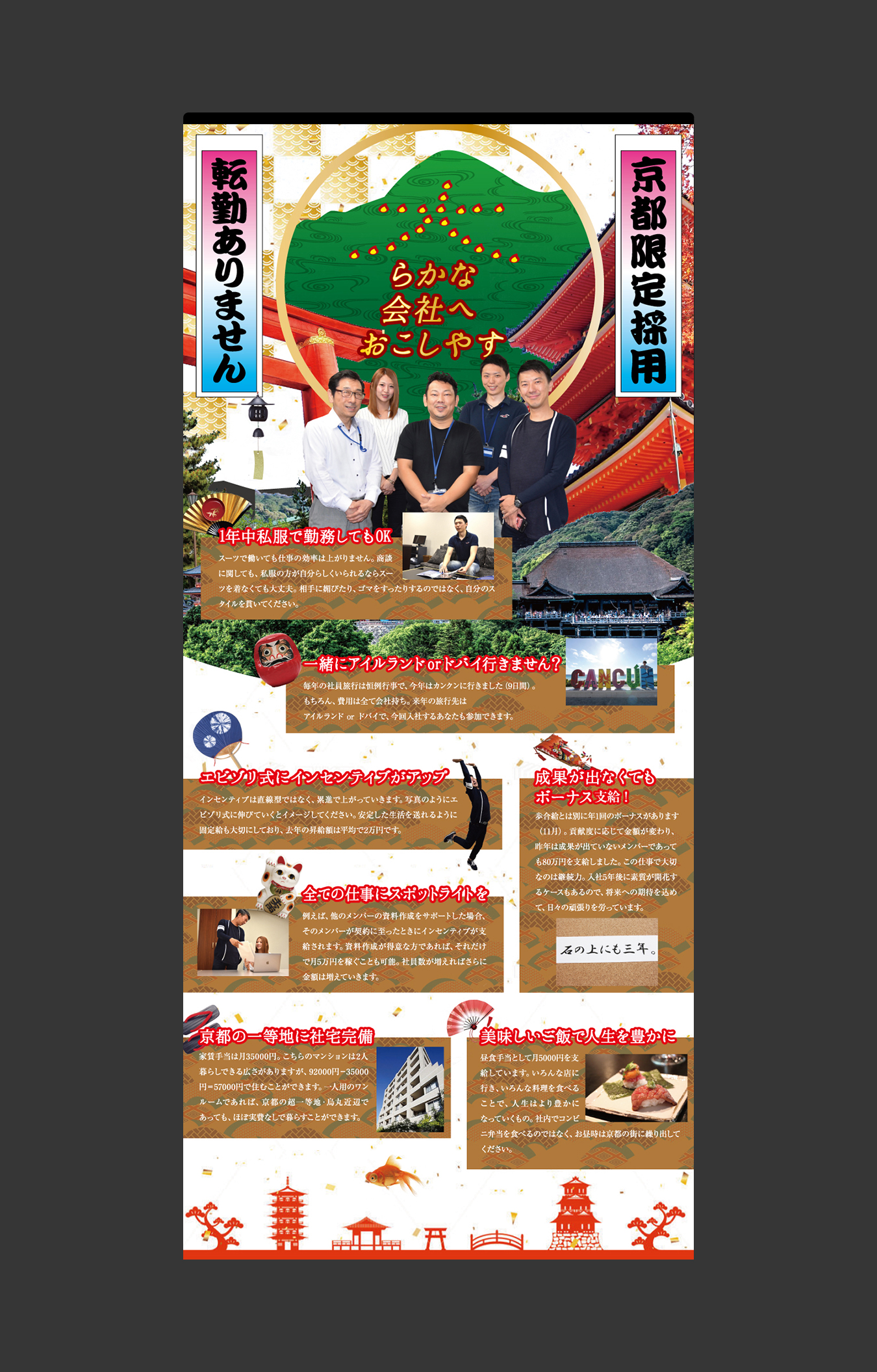 ・デザインを京都に寄せることで、京都に住みたい人たちを全国から集客 ・「大らかな会社」というコンセプトのもとに福利厚生を集約し、会社をブランディング ・影での地味な頑張りを評価することを訴求し、結果として営業職志望ではなかった求職者を採用