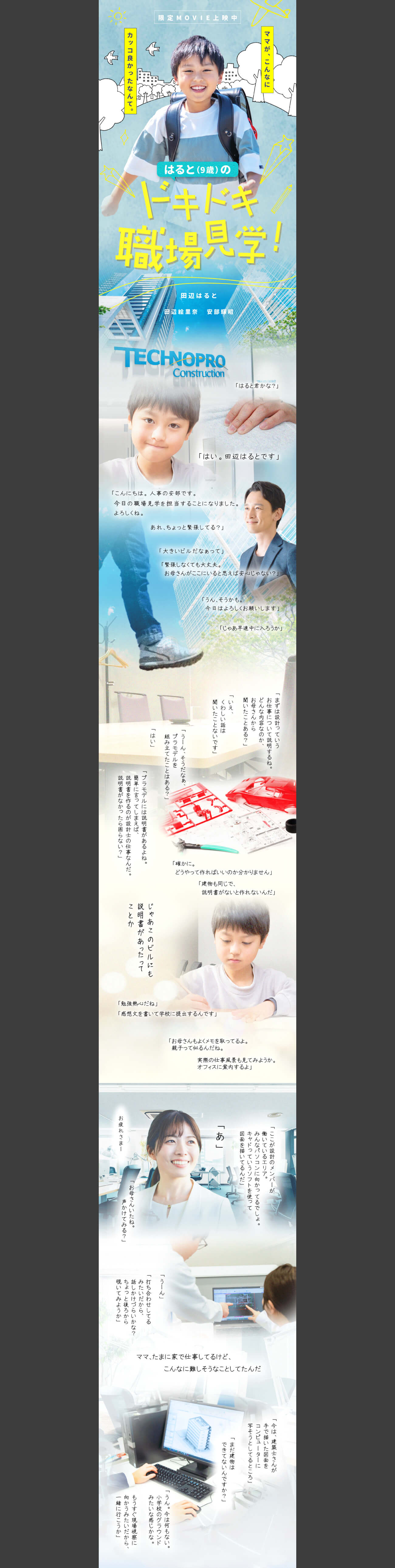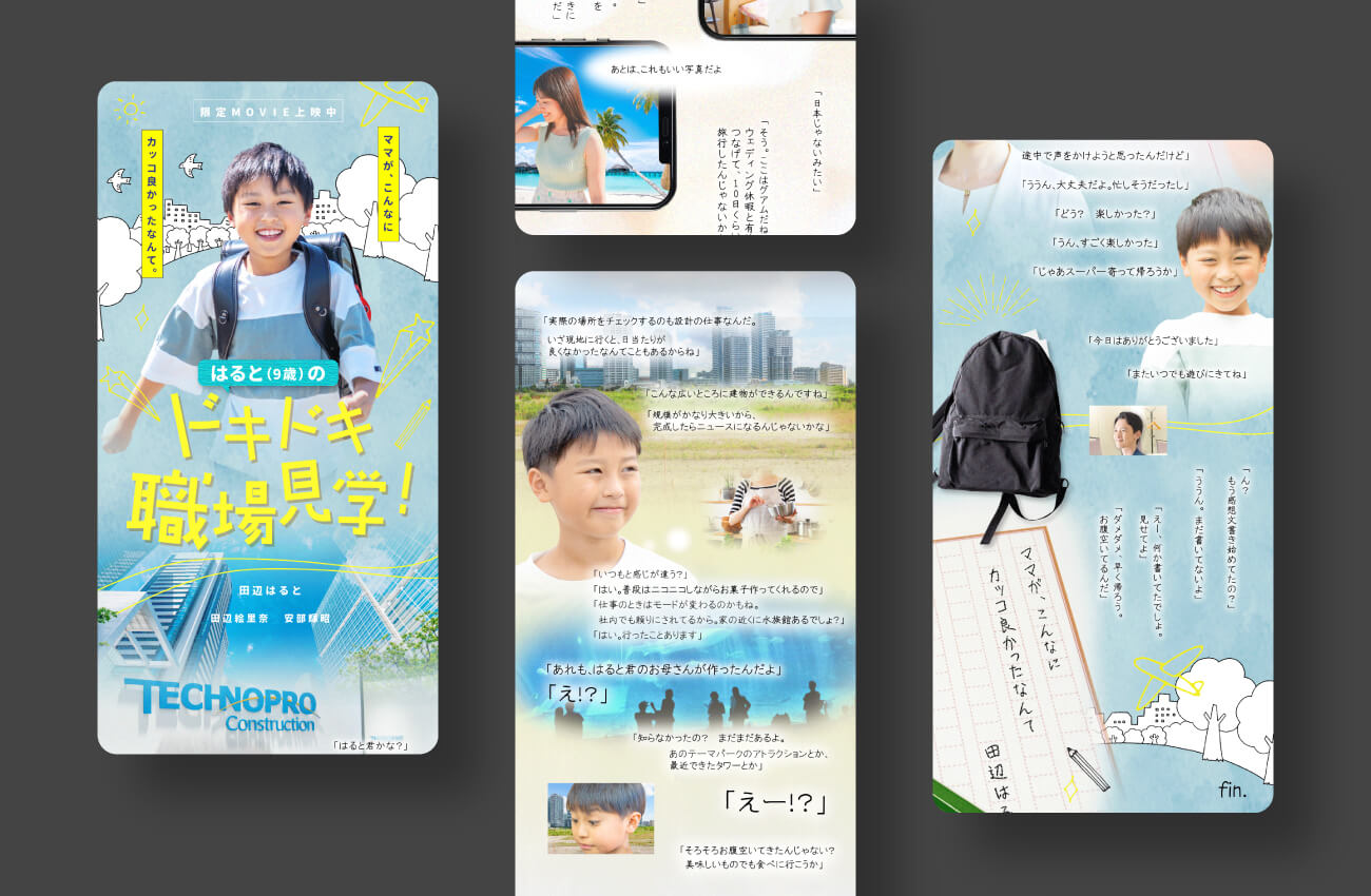 本シナリオでは、人事担当様がガイド役となり、設計職の仕事内容などを解説。現場の視察にも同行し、これまでに多数の有名施設を手掛けていることなど、設計士としての母親の活躍振りを伝えています。また、若かりし頃の母を語るシーンでは、スクールを熱心に利用していたこと、結婚後にウェディング休暇を利用したこと、昔は社宅に住んでいたことなど、会社の特徴を随所に交えた会話を展開。最後には「ママがこんなにカッコ良かったなんて」と子ども目線での憧れを描き、余韻を残すエンディングとしました。